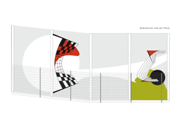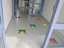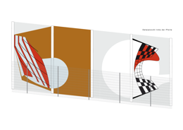 Der Besuchsraum ist der einzige Ort der JVA, in dem der Inhaftierte Kontakt zur Aussenwelt erhält, mit der Familie oder Freunden. Die Begegnung ist ein besonders sensibler Moment, der trotz Glasbarriere und Aufsicht, die Möglichkeit des Austauschs bietet. Es besteht nur ein kurzer Zeitrahmen, in dem sich die Welt des Inhaftierten mit der des Besuchers verbindet. In diesem Rahmen ist das Gespräch, aber auch die Betrachtung von wesentlicher Bedeutung. Daher habe ich für den Besuchsraum eine Bildfolge von Leuchtkästen entwickelt, in der das Thema Kommunikation als diskrete Anmutung erscheint. In verschiedenen atmosphärischen Lichtszenarien begegnen sich Menschen, positionieren sich, suchen und finden den Dialog, auch das Selbstgespräch. Die Fotografien sind so sehr verfremdet, daß der Betrachter sie nicht einer konkreten Örtlichkeit zuordnen kann. Die bewegten Lichtspiele bilden eher einen bühnenartigen Hintergrund für Personen, die teils nur verschwommen, leicht transparent, als Schatten, Zeichnung oder maskenartige Köpfe wahrzunehmen sind. In dem Entwurf verzichte ich bewußt auf die Darstellung von Realität ausserhalb der Gefängnismauern. Es sollen keine unerfüllbaren Sehnsüchte geweckt werden. Sondern diese Bilder stellen eine gestaltete Bildwelt dar, mit atmosphärischem Klang, die Ruhe in der Bewegung vermitteln und den Dialog anregen.